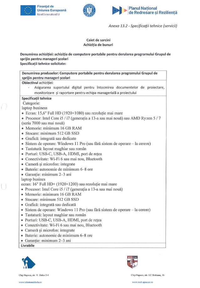 Közzétéve: 2026.02.09. 07:53 Caiet de sarcini Achiziția de computere portabile în cadrul proiectului PPEE